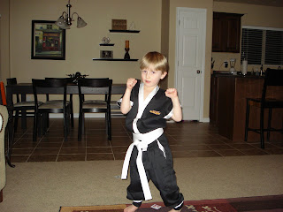 Gavin had his first Karate lesson today. He was pretty nervous on the way there, but once we got there he warmed up and had a lot of fun. The instructor was great with him and made him feel really comfortable. He did a great job and on the drive home kept telling me how he wanted to practice his moves. When daddy came home from work he ran and put on his uniform and started showing him all learned. It was very cute to see him so excited about it. After showing off his moves he ran around the room for about an hour shouting nonsense. That boy has a lot of energy. I wish I could have even a fourth of what he has. I'm really excited for him and I hope this will help build his self confidence. Please ignore the mess of memory cards strung all over the floor.